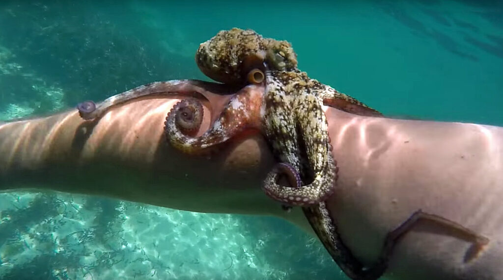 Shane Brown signaled for us to stay back, his camera capturing every ripple of the creature’s mantle. It was a moment of pure, interspecies connection, but the weight of the animal was starting to pull Sammy down. The grip was firm, almost possessive, as if the octopus had found something it didn’t want the ocean to take back. Sammy tried to kick her fin, but the animal tightened its hold.